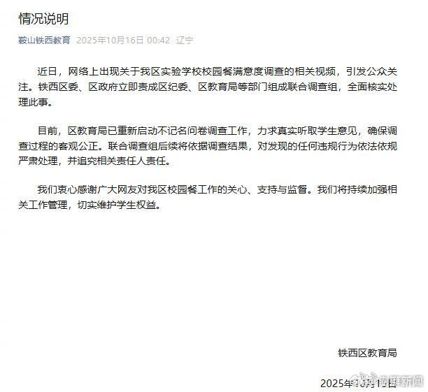 遼寧省鞍山市鐵西區(qū)教育局微信公眾號10月16日發(fā)布情況說明稱,鐵西區(qū)委、區(qū)政府立即責(zé)成區(qū)紀(jì)委、區(qū)教育局等部門組成聯(lián)合調(diào)查組,全面核實處理此事。目前,區(qū)教育局已重新啟動不記名問卷調(diào)查工作,力求真實聽取學(xué)生意見,確保調(diào)查過程的客觀公正。聯(lián)合調(diào)查組后續(xù)將依據(jù)調(diào)查結(jié)果,對發(fā)現(xiàn)的任何違規(guī)行為依法依規(guī)嚴(yán)肅處理,并追究相關(guān)責(zé)任人責(zé)任。(據(jù)10月16日澎湃新聞)