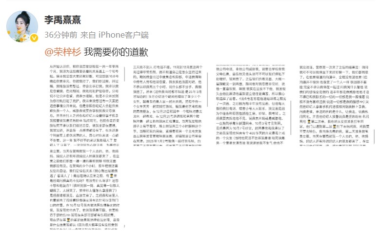 工作室在聲明中列舉了多項具體行為,包括言語騷擾、惡意造謠、精神施壓等,稱李禹熹曾通過電話、短信及社交媒體多次干擾榮梓杉及其工作,甚至以偽造言論和虛假材料進行施壓。
