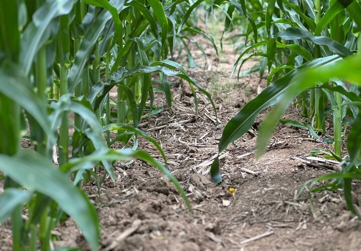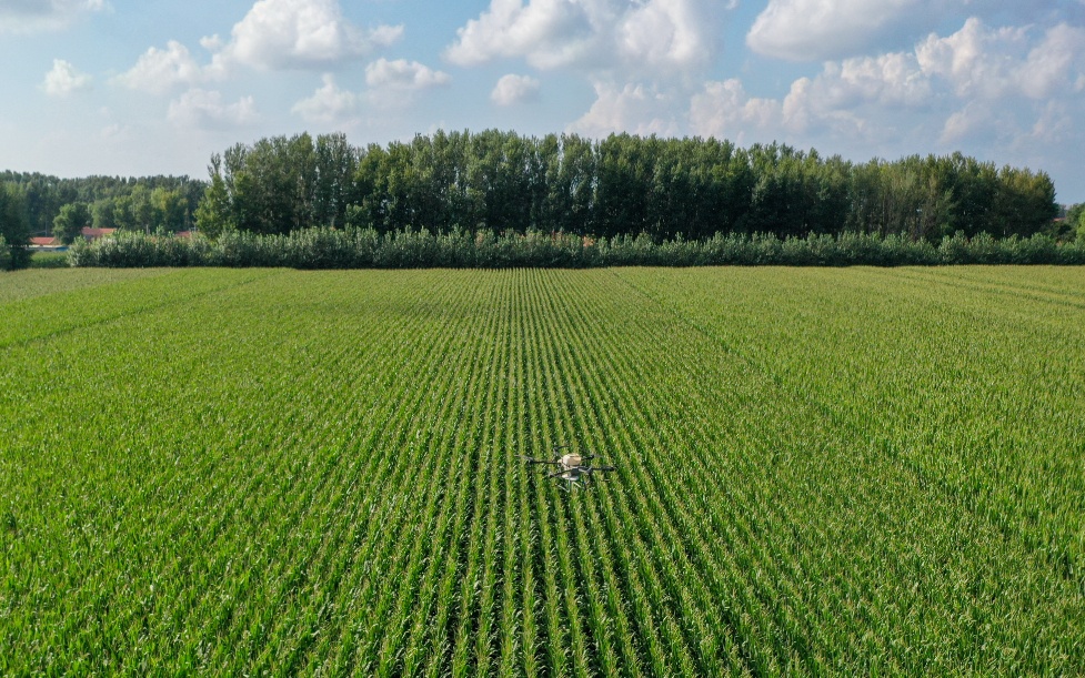 7月21日,在位于吉林省四平市梨樹縣的“科技小院”試驗(yàn)田,植保無人機(jī)為玉米精準(zhǔn)施肥(無人機(jī)拍攝)。新華社記者 張楠 攝