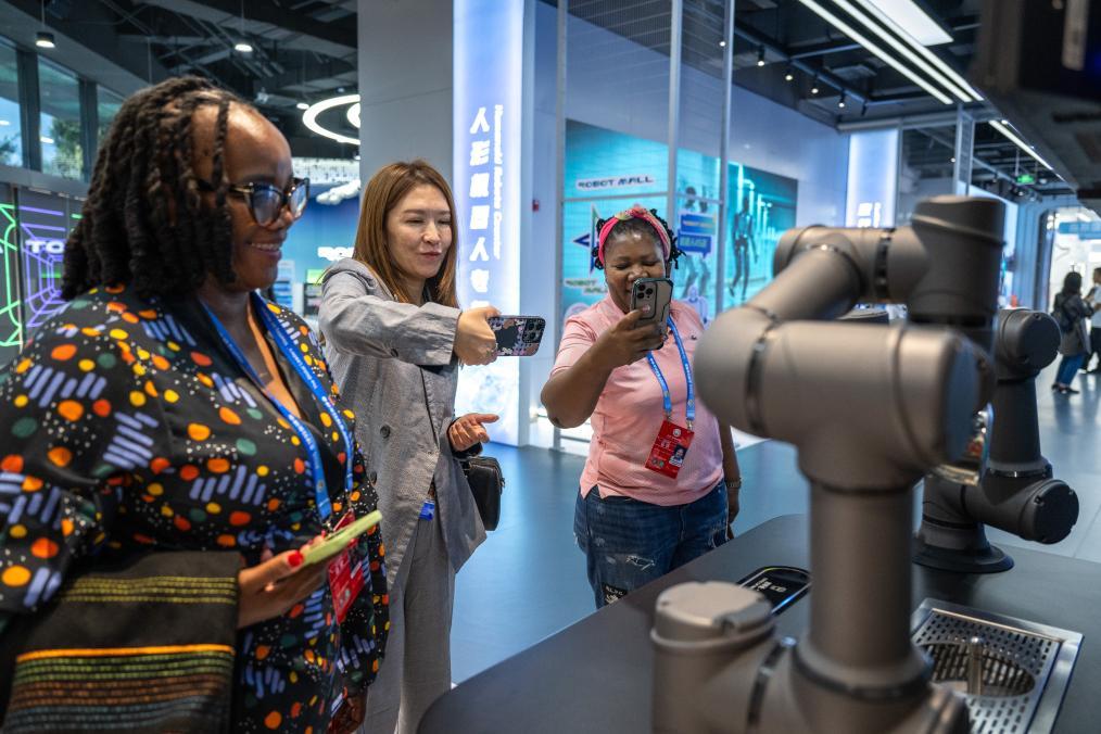 10月14日,全球婦女峰會參會嘉賓在北京經開區機器人大世界了解機器人制作咖啡。新華社記者 杜子璇 攝