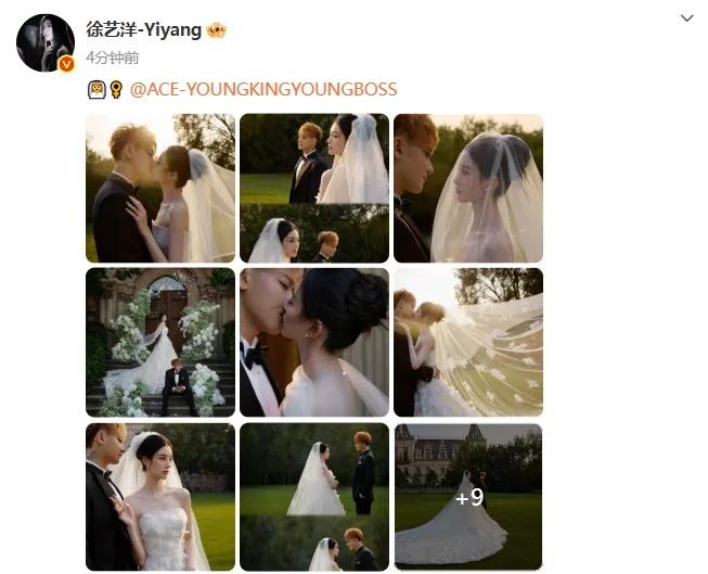 15日,黃子韜徐藝洋婚紗照公開,兩人各曬出不同的18張婚紗照,并@對方。照片中,兩人在草坪上擁吻,將浪漫拉到極致;還有兩人坐在車上、臺階上,幸福美滿。