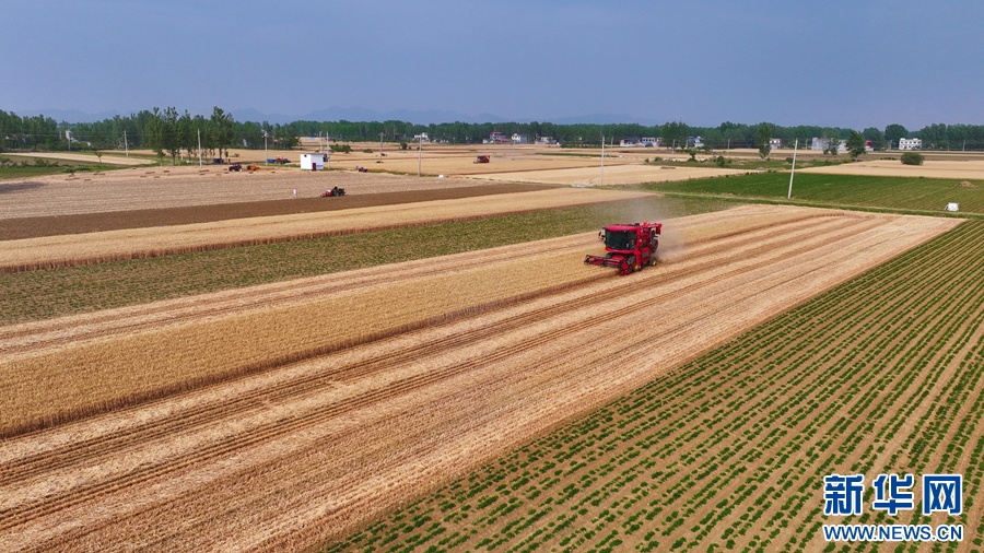 5月19日,在河南省南陽市社旗縣郝寨鎮石橋村,收割機在收獲小麥。新華網發(張舉 攝)