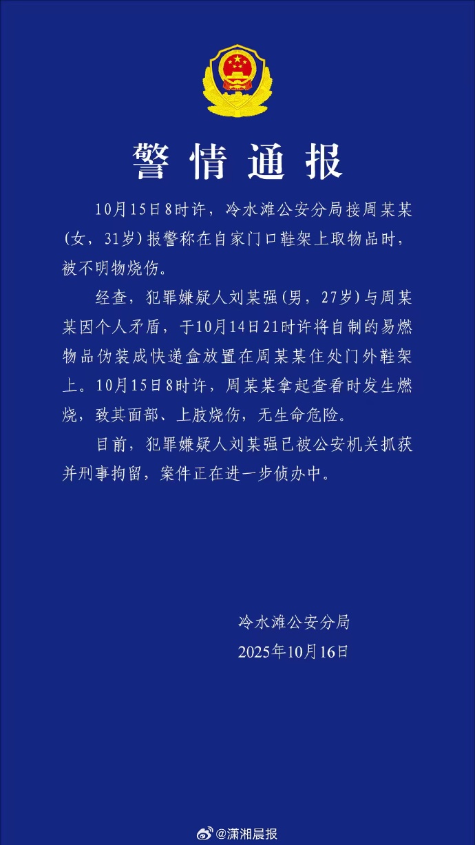 經查,犯罪嫌疑人劉某強(男,27歲)與周某某因個人矛盾,于10月14日21時許將自制的易燃物品偽裝成快遞盒放置在周某某住處門外鞋架上。10月15日8時許,周某某拿起查看時發生燃燒,致其面部、上肢燒傷,無生命危險。