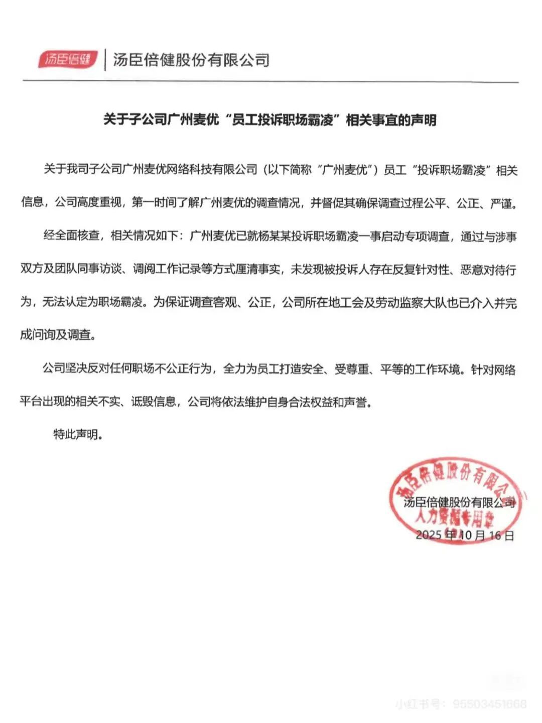 10月16日,“湯臣倍健招聘”發布關于子公司廣州麥優員工投訴“職場霸凌”事宜聲明: