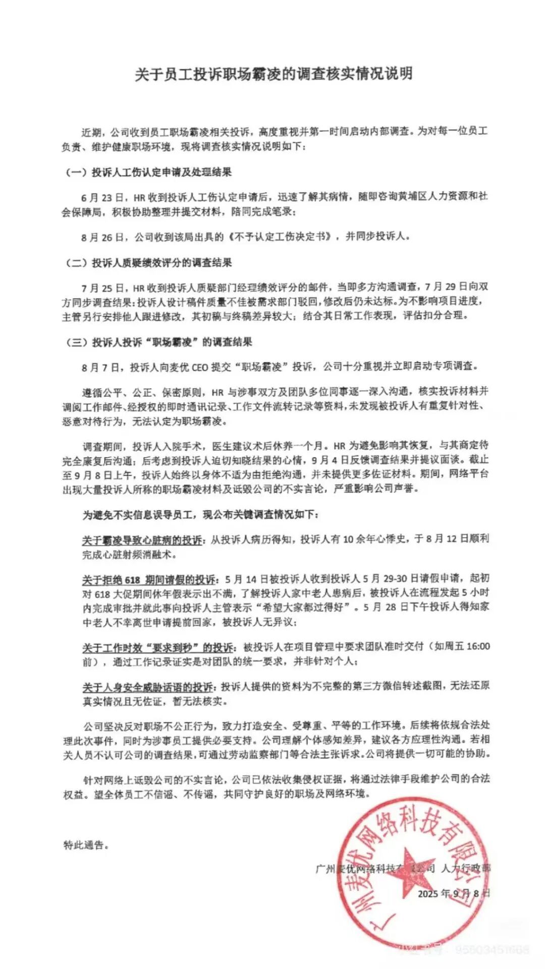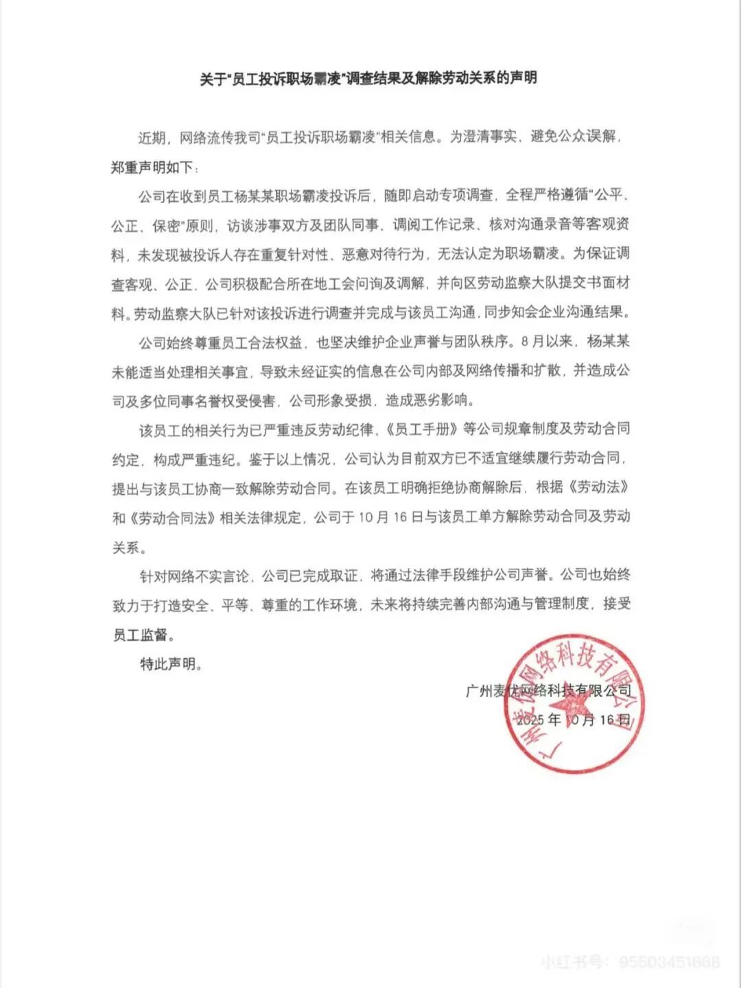 廣州麥優已就楊某某投訴職場霸凌一事啟動專項調查,通過與涉事雙方及團隊同事訪談、調閱工作記錄等方式厘清事實,未發現被投訴人存在反復針對性、惡意對待行為,無法認定為職場霸凌。為保證調查客觀、公正,公司所在地工會及勞動監察大隊也已介入并完成問詢及調查。