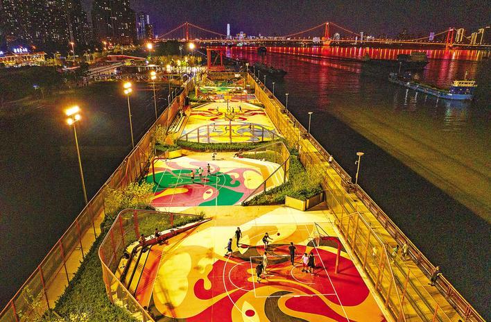 夜幕降臨,武漢市漢陽區(qū)楊泗港都市T臺“國風(fēng)”籃球場燈火輝煌。(湖北日報(bào)全媒記者 朱熙勇 攝)