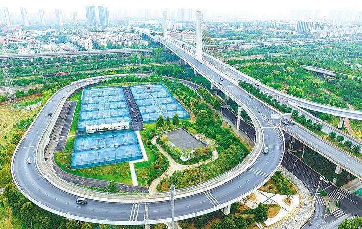 10月16日,鳥瞰武漢洪山區(qū)烽火路與楊泗港快速通道交會處的橋下運動空間,該空間約3萬平方米,足球場、網(wǎng)球場等設(shè)施設(shè)備一應(yīng)俱全,足球場已正式對市民開放。這一塊緊鄰鐵路、閑置多年的橋下空地,經(jīng)過精心改造,華麗變身全民運動空間。