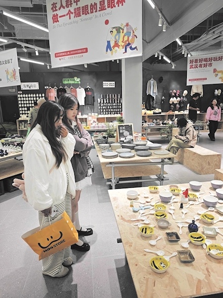 目前,“等于幾”在全國共有14家門店,在武漢已布局有2家門店。此外,在長沙、揚州等地因地制宜打造了街區店、獨棟店等不同形態。“我們堅持‘一地一景’的運營策略。每進入一座城市,品牌都會結合當地特色打造專屬瓷器周邊。比如,武漢門店推出的印有手端一碗熱干面造型、‘勒是武漢’字樣的瓷盤,以及‘武漢青年’主題T恤,將地域文化與文創產品巧妙結合。”張丹說。