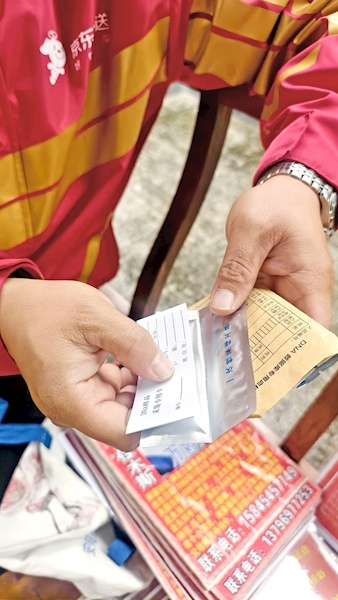 10月15日午后,在武漢市江岸區(qū),剛完成午高峰送餐任務(wù)的京東外賣騎手彭智華,從送餐箱里取出厚厚一沓尋親信息卡和DNA樣品采集卡。“這些東西我一直隨身攜帶,就是為了能找機會擴散信息,給尋親家庭帶來更多希望。”他對極目新聞記者說。