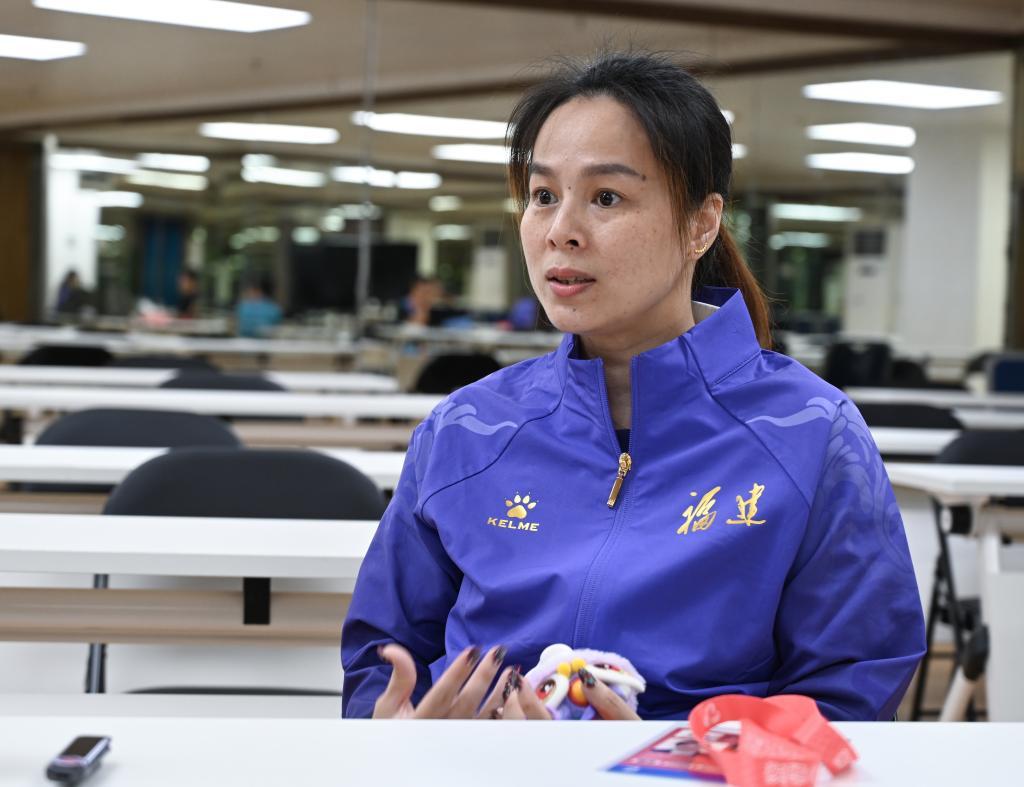 記者近日在廣州體育館見到了她——梳著馬尾,手里拿著醒獅造型的十五運會吉祥物,一身福建隊紫色隊服,依然保留著當年運動員時期的颯爽英姿。
