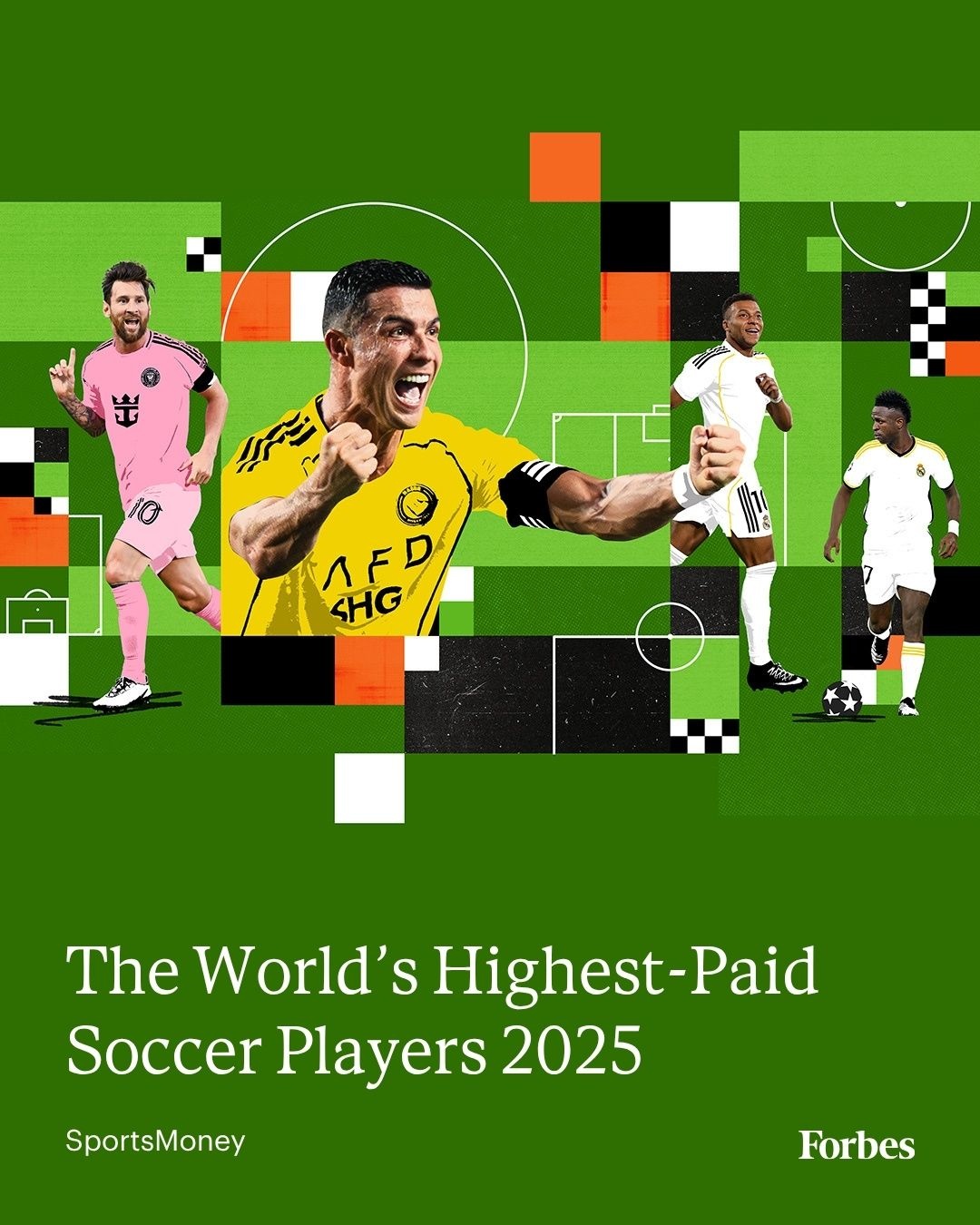 10月16日,福布斯公布了2025年收入最高的足球運動員,其中40歲的C羅以2.8億美元斷層領跑,梅西1.3億美元第二,本澤馬第三、姆巴佩第四、18歲亞馬爾第十。