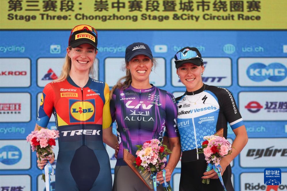 10月16日,賽段前三名麗芙-埃爾奧拉-杰科車隊澳大利亞車手塔爾博特(中)、歷德崔克車隊荷蘭車手馬庫斯(左)、瓦爾克韋塞爾斯職業車隊荷蘭車手克尼嫩堡在頒獎儀式上。