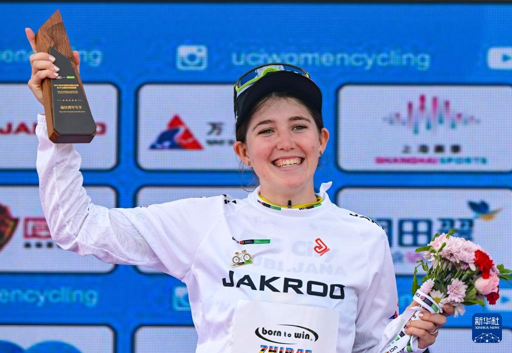 10月16日,BTC城市盧布雅爾那車隊哈薩克斯坦車手斯克利亞羅娃身著代表最佳青年車手的白衫在頒獎儀式上慶祝。