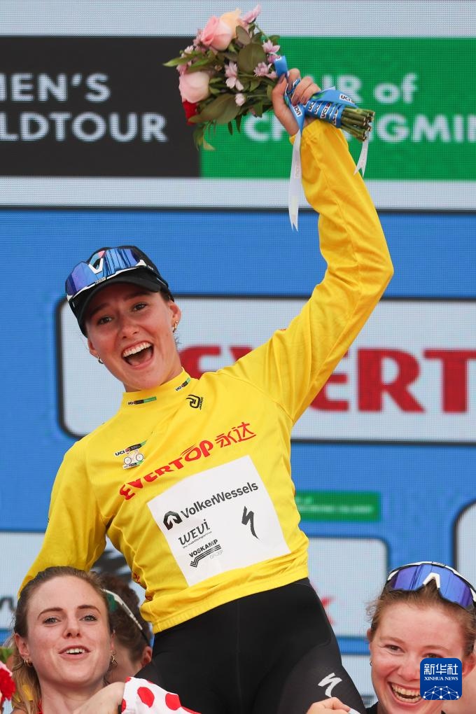 10月16日,瓦爾克韋塞爾斯職業車隊荷蘭車手克尼嫩堡身著代表總成績第一名的黃衫在頒獎儀式上和隊友慶祝。