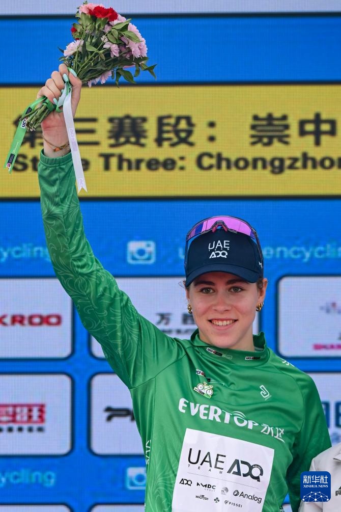 10月16日,阿聯酋ADQ車隊荷蘭車手范·羅伊延身著代表沖刺總積分第一名的綠衫在頒獎儀式上慶祝。