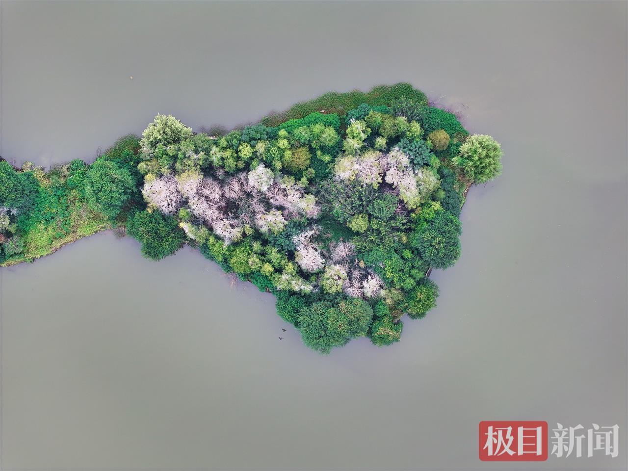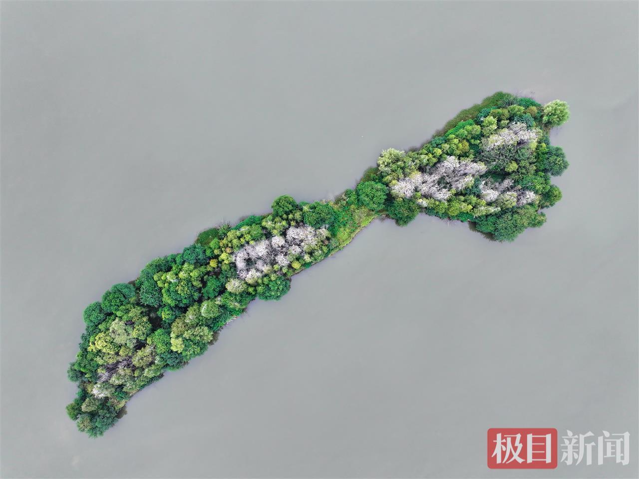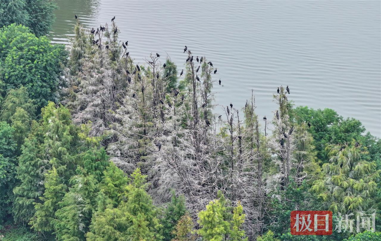 又到了一年候鳥遷徙季。近日,武漢東湖落雁景區的“走人棋鳥島”上迎來一批鸕鶿,它們將在這里停留越冬,捕魚為食。10月17日,記者在現場看到,湖心小島的樹梢上停滿了通體烏黑的鸕鶿。從高空俯瞰,湖心島中心區域仿佛覆蓋了一層白雪,與周邊綠油油的枝葉形成強烈反差。實際上,這是鸕鶿的排泄物把樹木染成了白色。