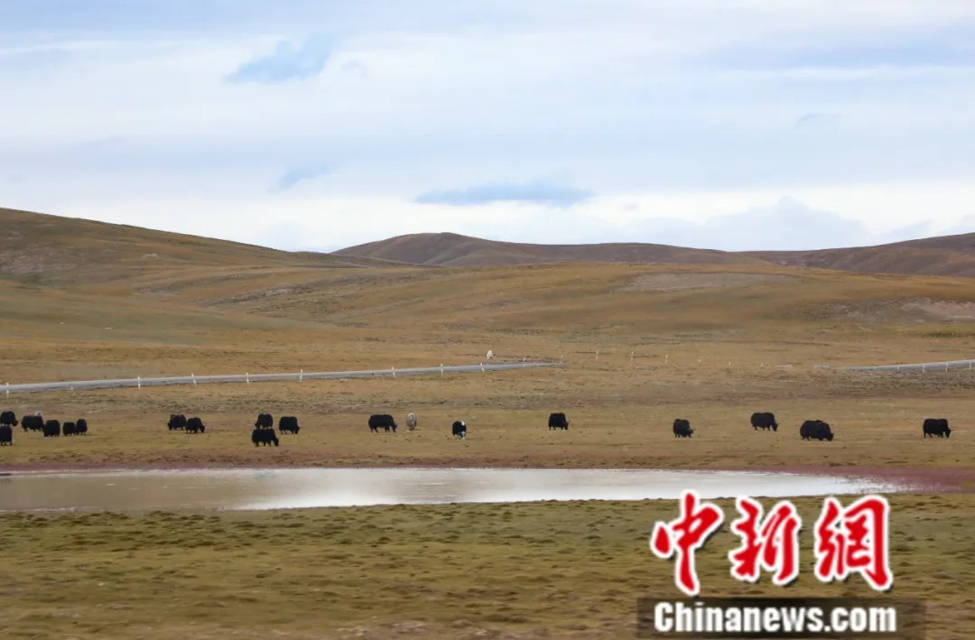2025年9月20日,牦牛在青海省果洛藏族自治州黃河源頭鄂陵湖畔覓食。中新社記者 馬銘言 攝