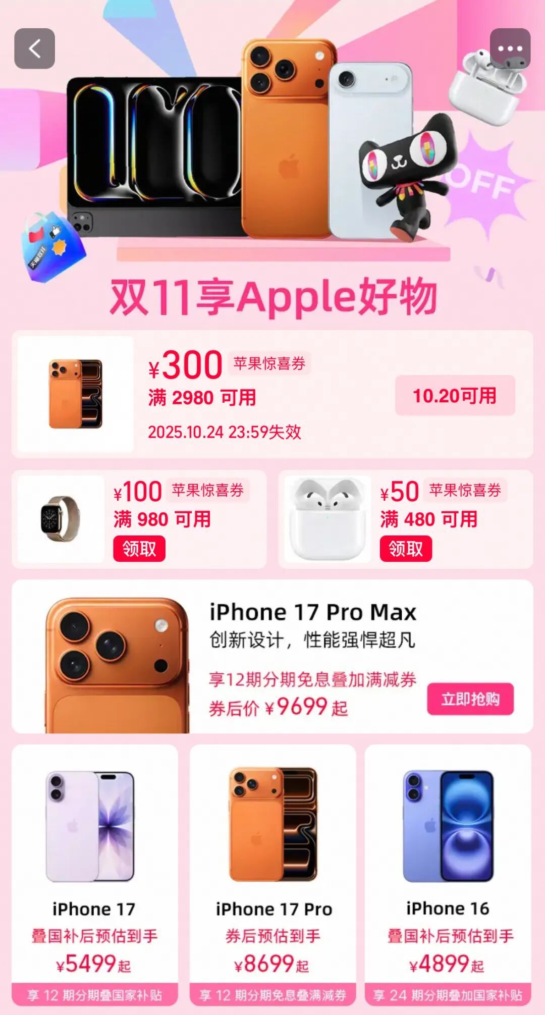 10月17日,蘋果官方旗艦店官宣參加天貓雙11活動(dòng),10月20日晚8點(diǎn)現(xiàn)貨開賣。