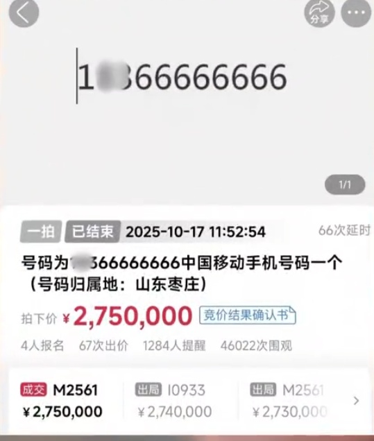 10月17日中午,大皖新聞記者從阿里資產平臺看到,“1**66666666”的中國移動手機號第一次司法拍賣,已經成功拍出,成交價275萬元,超出起拍價75萬元。