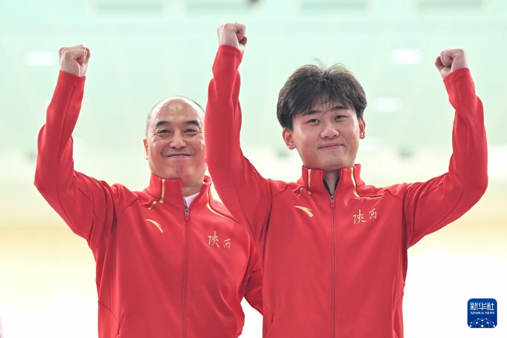 10月17日,冠軍陜西隊選手劉宇坤(右)和教練在頒獎儀式上。