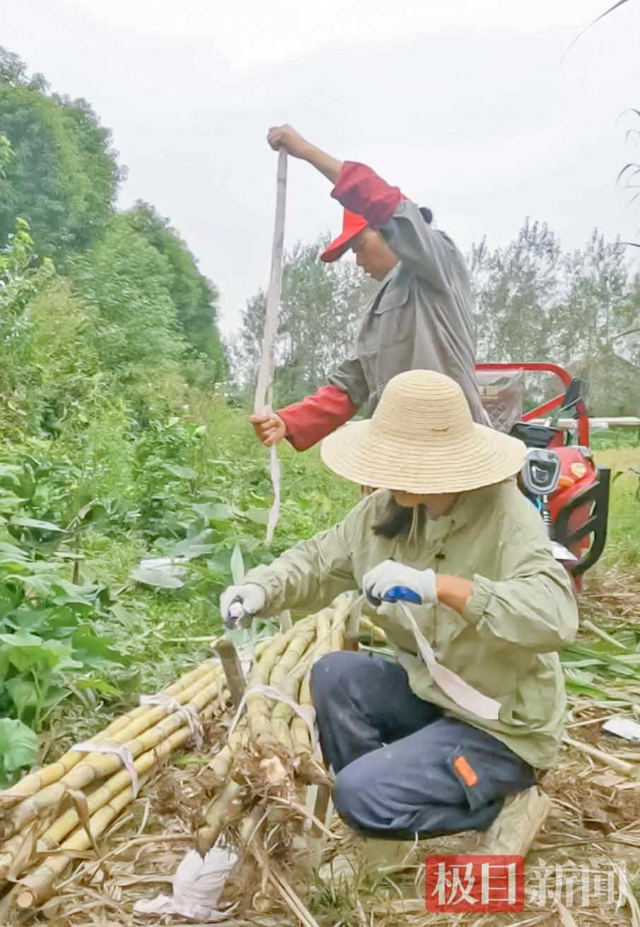 10月16日,湖北黃梅分路鎮戴壩村“長華采摘園”,戴靜和母親忙著將甘蔗捆綁裝車——這些甘蔗是由慕名而來的顧客訂購的,一共100根。