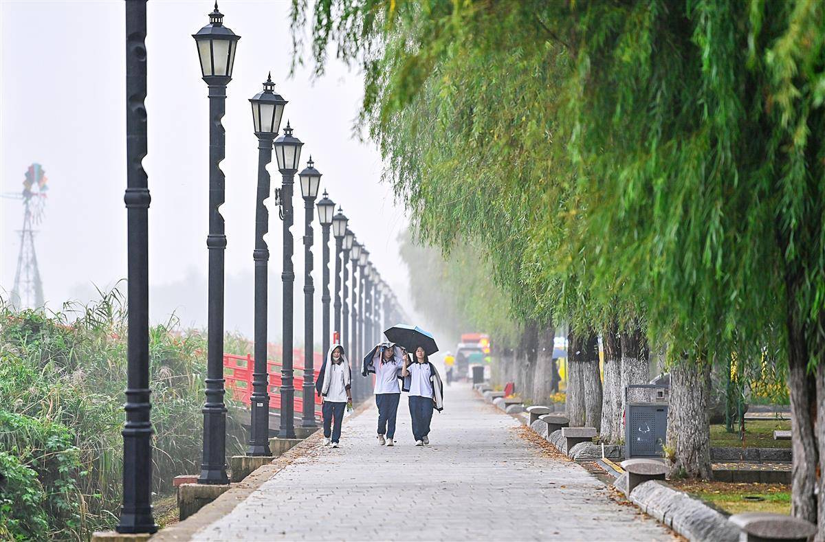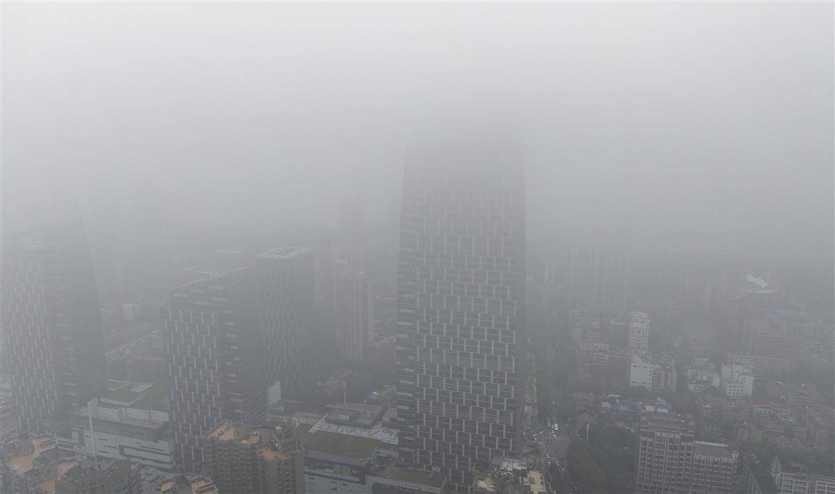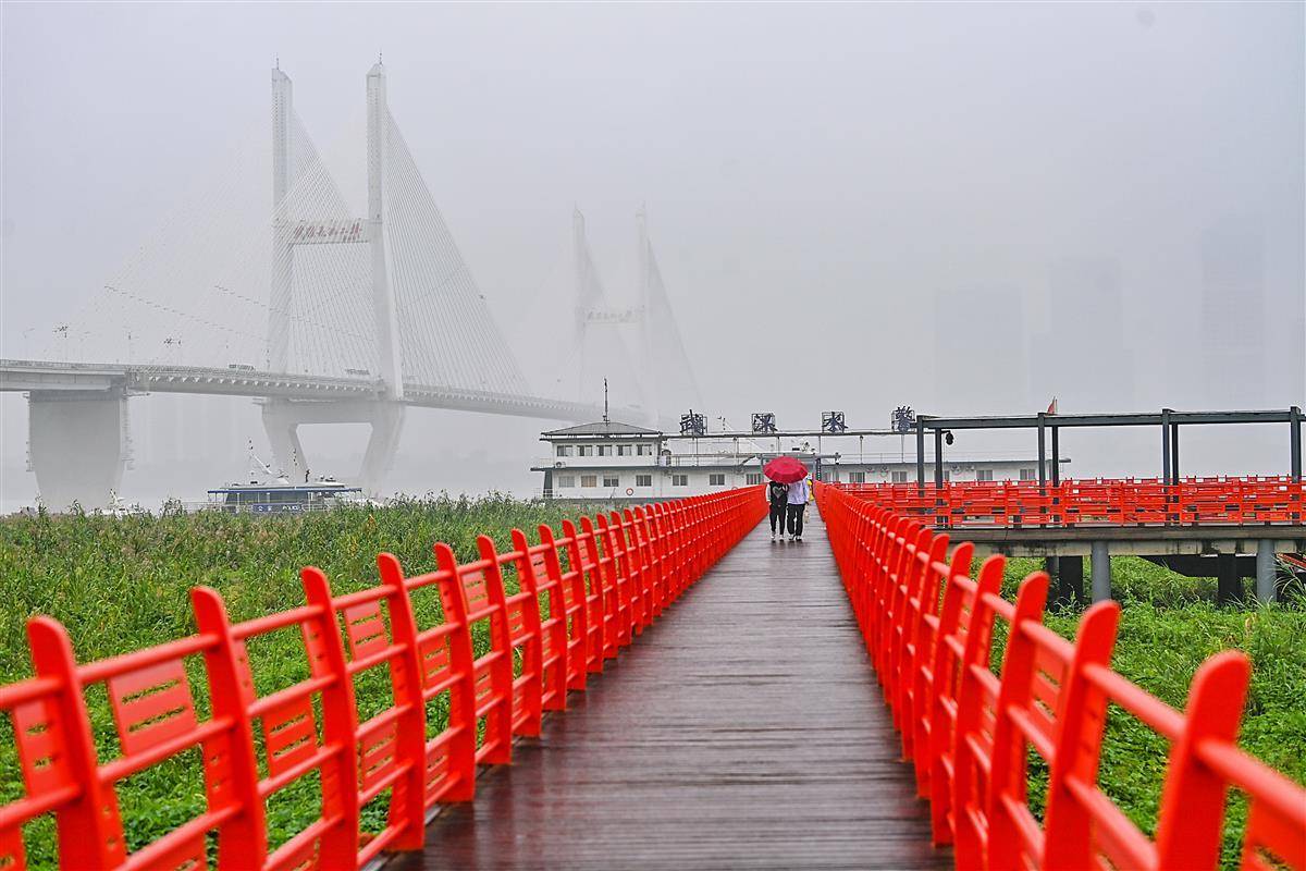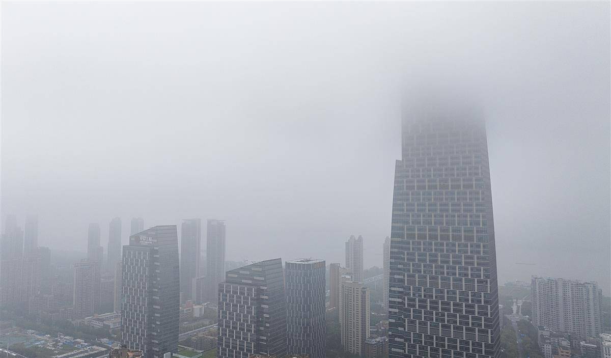 10月17日下午,武漢出現了濃霧天氣,整個城區被大霧籠罩。一些市民游客冒著毛毛細雨在漢口江灘游玩,觀賞到長江沿岸的高樓在濃霧中若隱若現,別有一番風味。(湖北日報全媒記者朱熙勇攝)