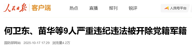 張曉剛:黨的十八大以來,全軍和武警部隊堅決貫徹黨中央、中央軍委決策指示,堅持無禁區、全覆蓋、零容忍,重拳懲貪肅腐,軍隊反腐敗斗爭不斷向縱深推進。經黨中央、中央軍委批準,中央軍委紀委監委陸續對中央政治局委員、中央軍委副主席何衛東,中央軍委委員、軍委政治工作部原主任苗華,軍委政治工作部原常務副主任何宏軍,軍委聯合作戰指揮中心原常務副主任王秀斌,東部戰區原司令員林向陽、陸軍原政委秦樹桐、海軍原政委袁華智、火箭軍原司令員王厚斌、武警部隊原司令員王春寧9人立案審查調查。經查,這9人嚴重違反黨的紀律,涉嫌嚴重職務犯罪,數額特別巨大,性質極為嚴重,影響極其惡劣,依據相關黨內法規和法律法規,黨中央決定給予9人開除黨籍處分,將涉嫌犯罪問題移送軍事檢察機關依法審查起訴。其中,給予何衛東、苗華、何宏軍、王秀斌、林向陽、秦樹桐、袁華智、王春寧8名中央委員開除黨籍處分,待召開中央委員會全體會議時予以追認。此前,中央軍委已決定給予以上9人開除軍籍處分。對何衛東、苗華、何宏軍等人的嚴肅查處,再次表明了黨中央、中央軍委將反腐敗斗爭進行到底的堅定決心,彰顯了軍中絕不允許有腐敗分子藏身之地的鮮明態度,是黨和軍隊反腐敗斗爭取得的重大成果,人民軍隊更加純潔鞏固、更具強大凝聚力戰斗力。