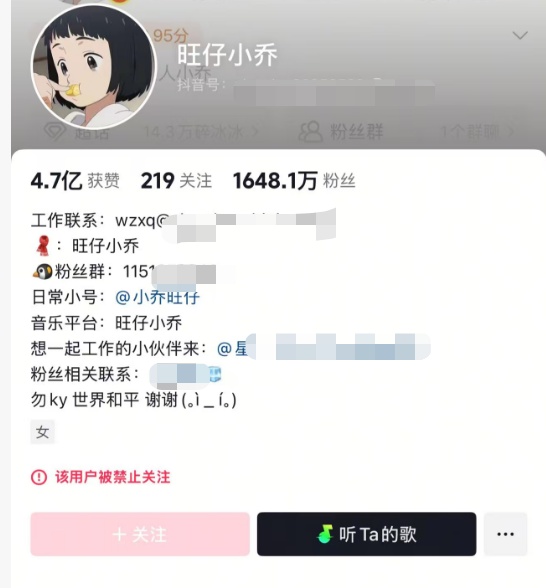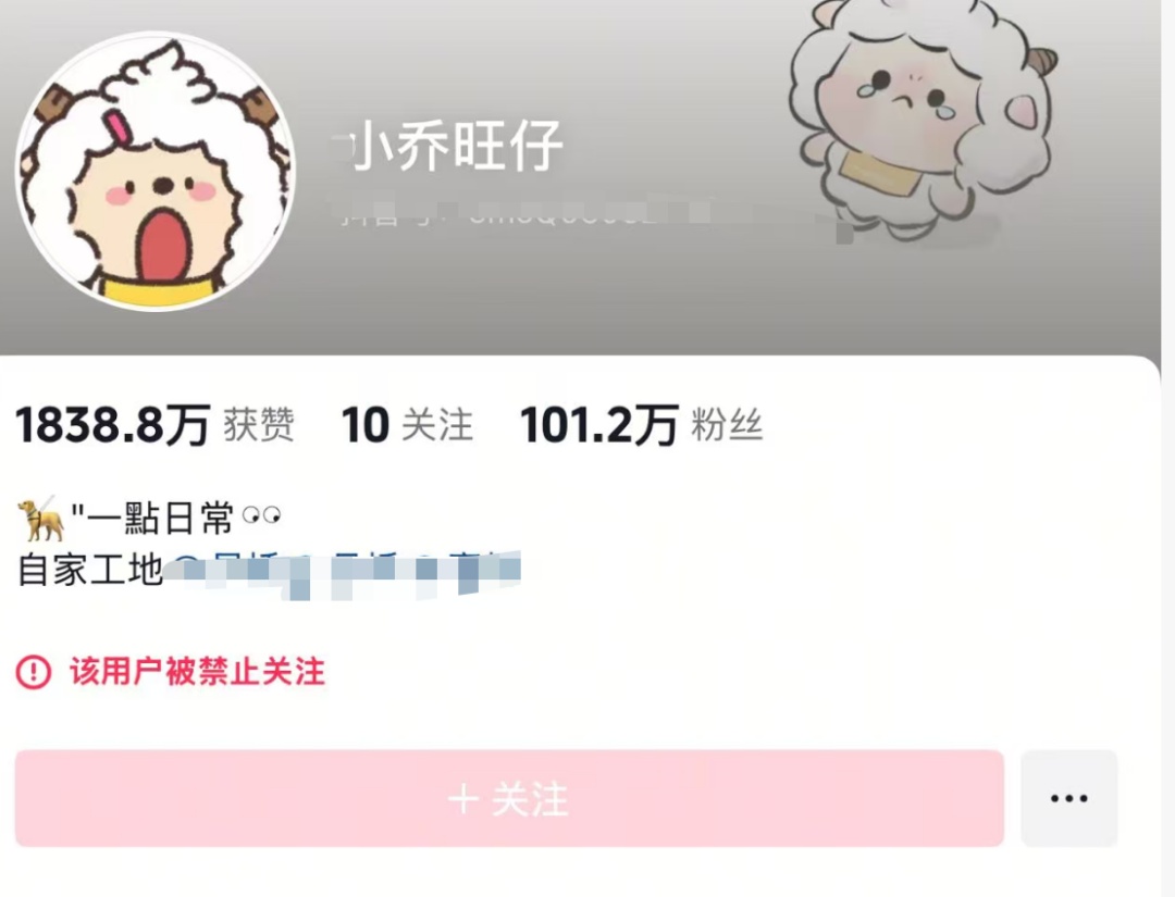 記者注意到,目前,“旺仔小喬”的兩個抖音賬號,仍是被“禁止關(guān)注”的狀態(tài)。
