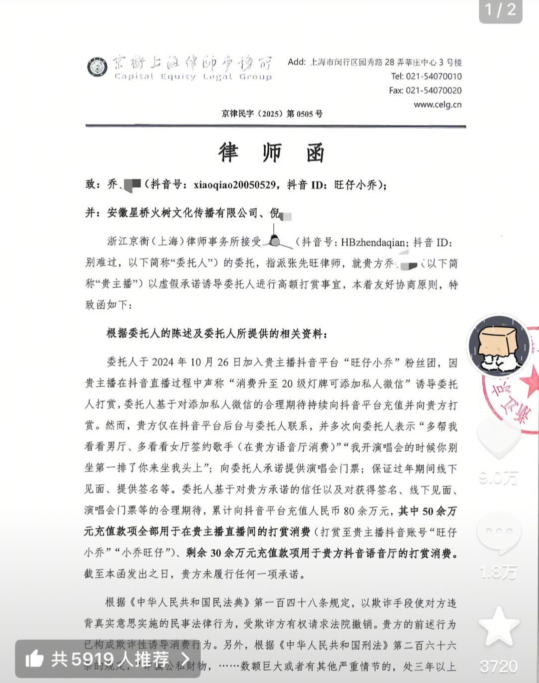 律師函要求“旺仔小喬”返還打賞80萬元
