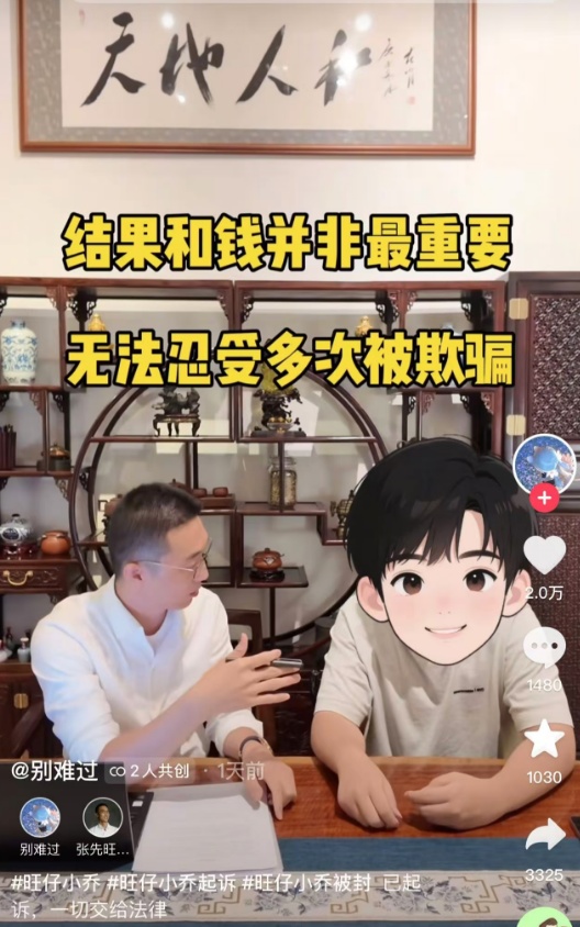 10月15日,抖音賬號“別難過”和“張先旺律師”發(fā)共創(chuàng)視頻稱:“已經(jīng)正式起訴“旺仔小喬”,結(jié)果和錢并非最重要,無法忍受多次被欺騙。一切交給法律。”