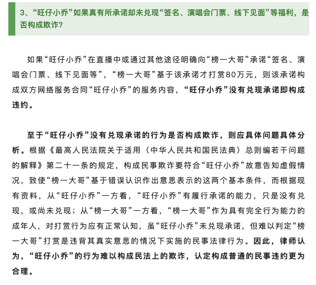 律師表示,如果“旺仔小喬”在直播中或通過其他途徑明確向“榜一大哥”承諾“簽名、演唱會門票、線下見面等”,“榜一大哥”基于該承諾才打賞80萬元,則該承諾構(gòu)成雙方網(wǎng)絡(luò)服務(wù)合同“旺仔小喬”的服務(wù)內(nèi)容,“旺仔小喬”沒有兌現(xiàn)承諾即構(gòu)成違約。