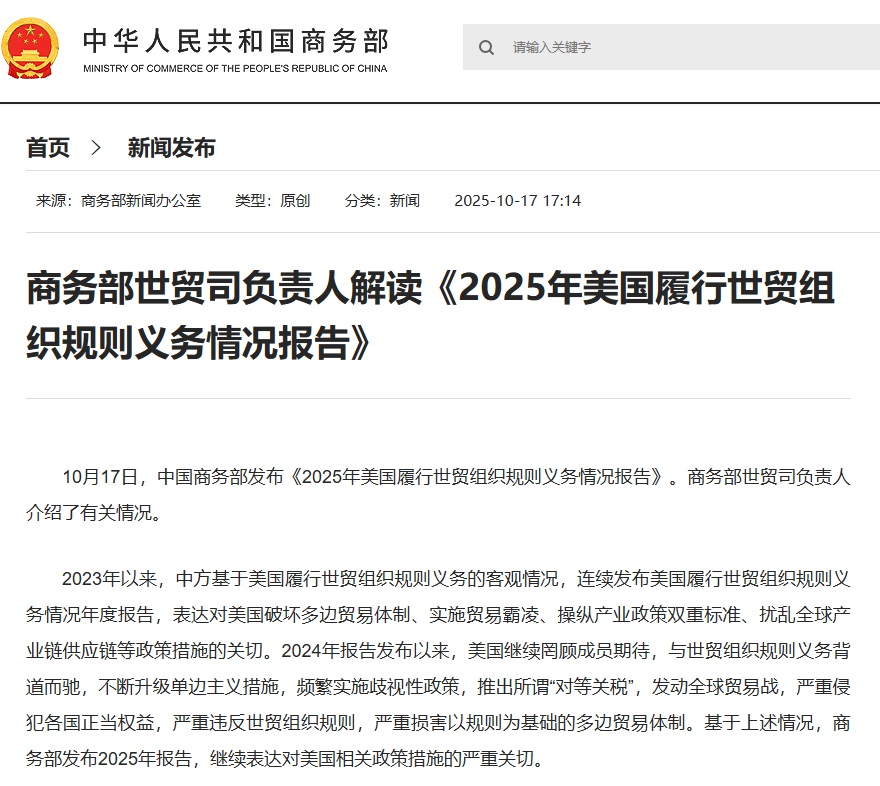 10月17日,中國商務部發布《2025年美國履行世貿組織規則義務情況報告》。商務部世貿司負責人介紹了有關情況。