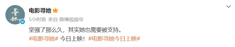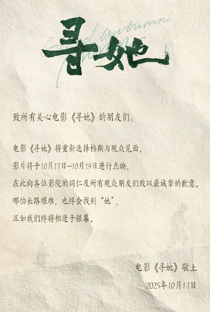 10月17日晚,電影《尋她》發布通知:將重新選擇檔期與觀眾見面,影片將于10月17日-10月19日進行點映。