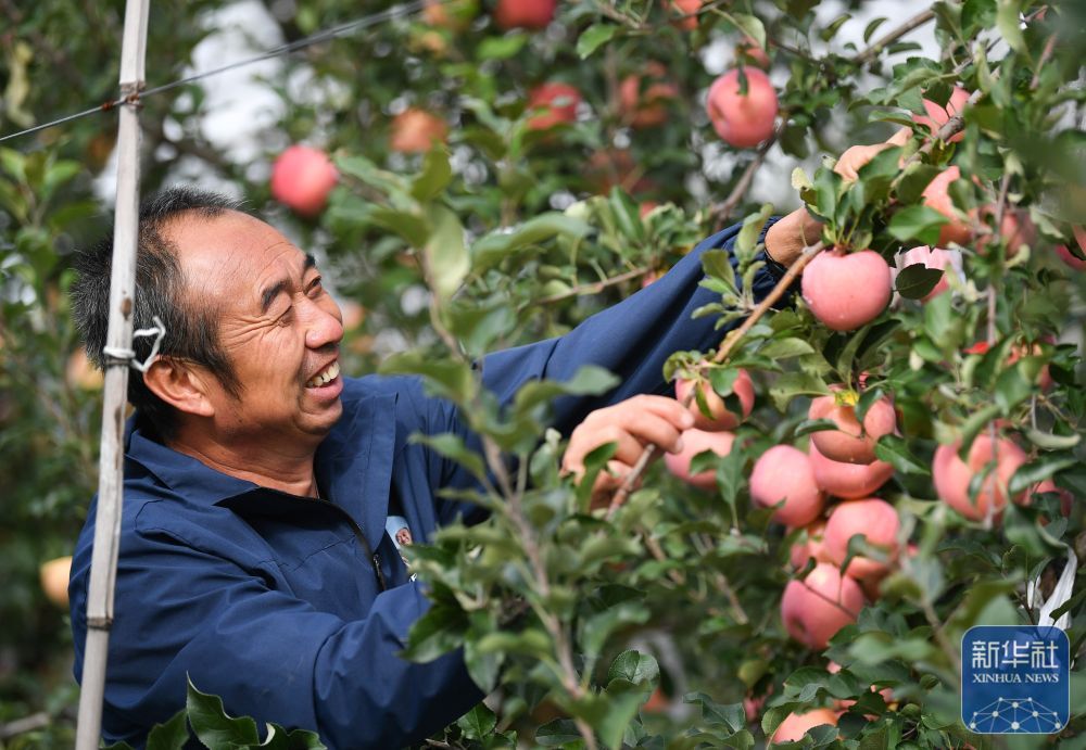 ↑ 10月17日,果農(nóng)在延安市寶塔區(qū)橋溝街道煙洞溝村采收蘋果。新華社記者 張博文 攝