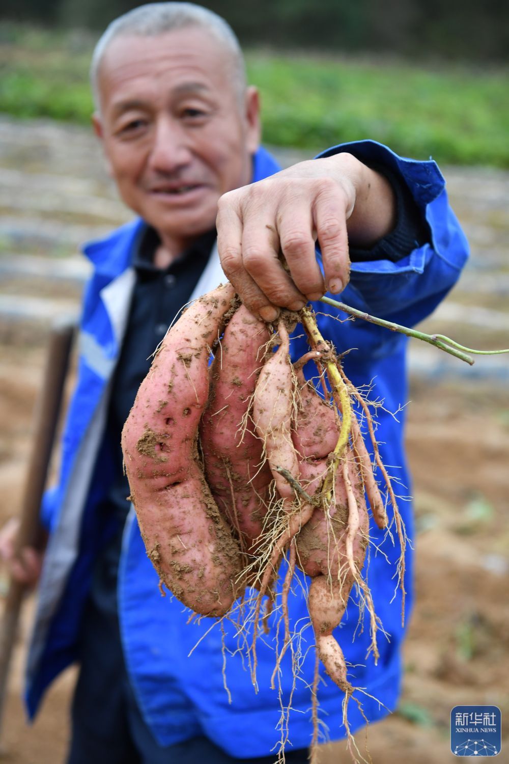↑ 10月16日,延安市寶塔區(qū)甘谷驛鎮(zhèn)羅家灣村村民羅維陽展示收獲的紅薯。新華社記者 邵瑞 攝