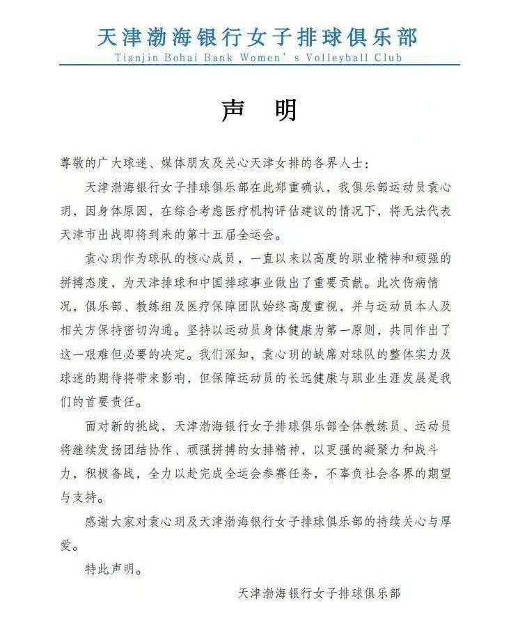 新華社天津10月18日電(記者張澤偉)天津渤海銀行女排俱樂部17日深夜發布聲明稱,袁心玥因傷病原因將缺席第十五屆全運會。