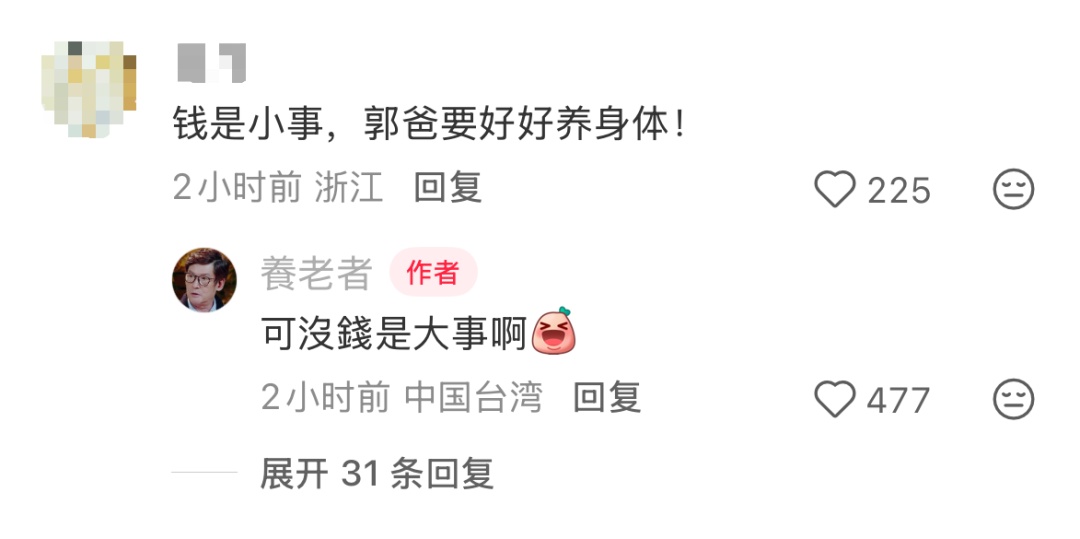 有網友在評論區留言:錢是小事,郭爸要好好養身體。郭碧婷父親回復:可沒錢是大事啊。
