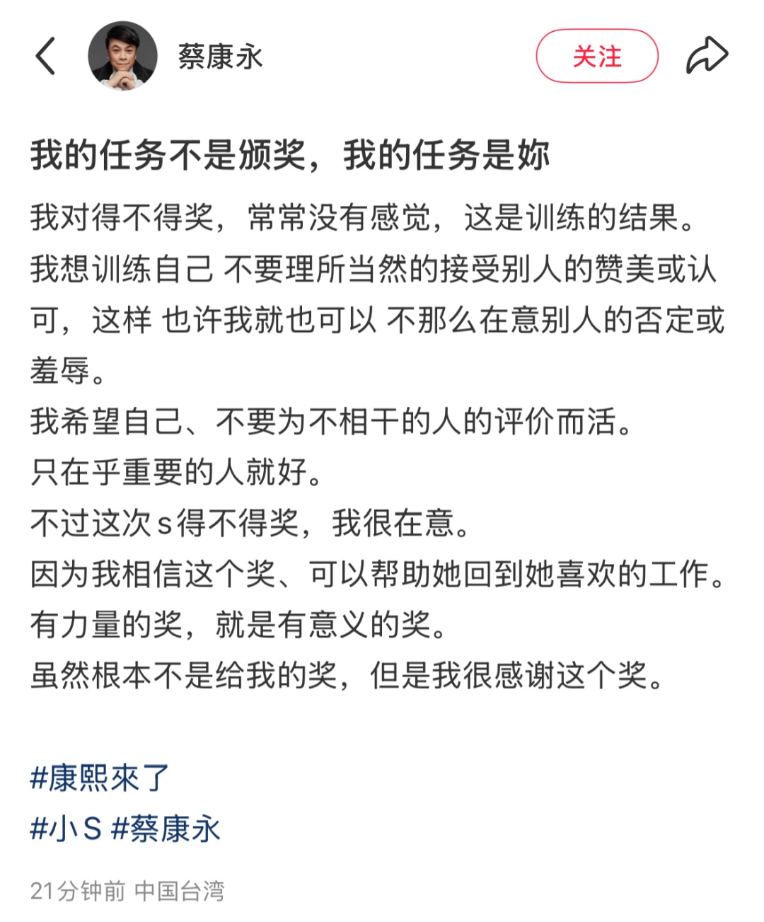 10月18日下午,蔡康永發(fā)文再回應(yīng)徐熙娣(小S)獲獎: