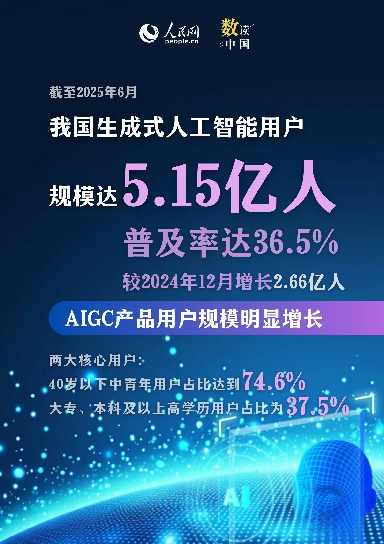 作為引領新一輪科技革命與產業變革的戰略性技術,人工智能正以前所未有的深度與廣度重塑人類的生產和生活方式。近年來,我國人工智能整體實力實現系統性躍升,綜合競爭力持續增強。隨著“人工智能+”行動邁向縱深,生成式人工智能(AIGC)技術迅速發展與迭代,新應用、新場景密集涌現,走進千家萬戶,賦能千行百業。讓我們通過一組關鍵數據,生動展現我國生成式人工智能應用蓬勃發展的生動圖景。