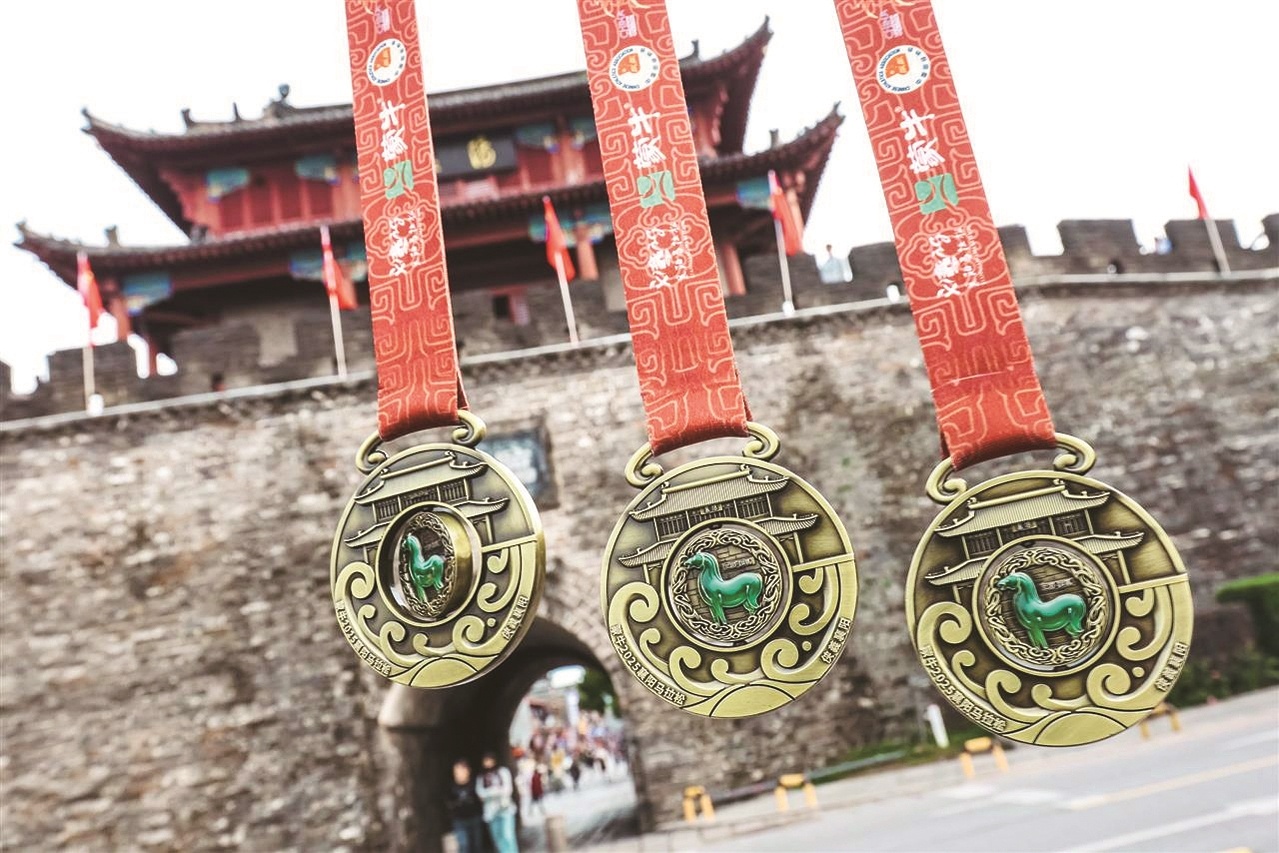 本屆賽事獎牌以“俠義襄陽”為設計理念,將城市文脈與馬拉松精神完美融合。獎牌采用可翻轉設計,正面以賽事名稱搭配古城墻磚紋、漢江水紋;背面則以襄陽市博物館鎮館之寶——三國青銅馬為核心,通過立體浮雕與青銅色果凍漆上色,還原文物神韻,實現“一面賽事、一面歷史”的視覺效果。