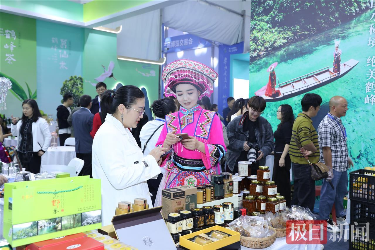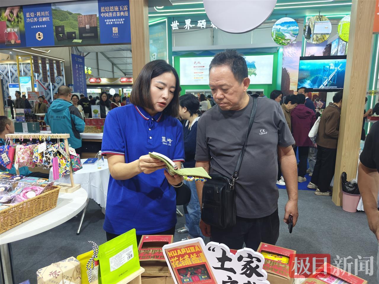 來鳳館內,色澤鮮潤的來鳳藤茶、香氣濃郁的鳳頭姜、優質山茶油、富硒貢米等數十種特色農特產品整齊陳列,琳瑯滿目。來鳳藤茶集團研發的“酉芯藤”新茶飲、“醒達”“睡達”功能片等衍生品也吸引了不少關注。湖北百順農業開發有限公司標準館內,鍋巴土豆以其酥脆的口感,也吸引了大量顧客前來品嘗、咨詢。