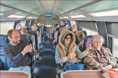 正午12時,列車正式發(fā)車。經(jīng)過短暫的提速后,車廂內(nèi)的電子顯示屏提示,列車開始以最高時速200公里行駛。許多乘客紛紛拿出手機(jī)與朋友們在電子顯示屏前合影留念。乘客德拉甘對記者表示:“這條鐵路將塞爾維亞的城市以高效方式連接在一起,這是我們國家邁向現(xiàn)代化的重要象征。塞爾維亞能擁有這樣的高鐵,證明了國家在進(jìn)步、在發(fā)展。”