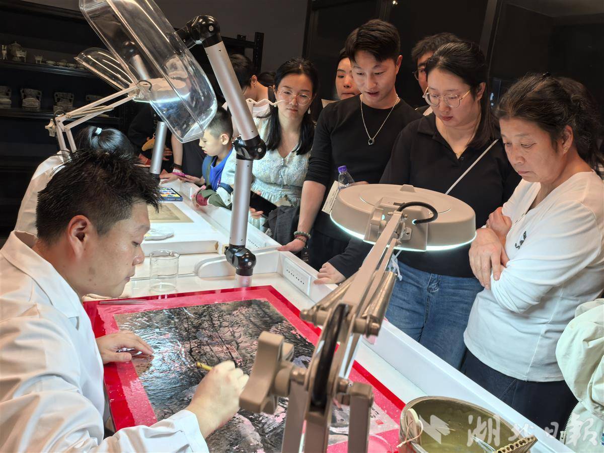 當(dāng)天,“秋游尋楚·夜探展廳”活動(dòng)中,志愿者身著傳統(tǒng)服飾,在《楚國八百年》展廳沿精心設(shè)計(jì)的路線,帶觀眾探尋楚國發(fā)展脈絡(luò);“漆韻千年·曲水流觴”活動(dòng)中,參與者手持耳杯重溫魏晉文人雅集。古書畫裝裱修復(fù)技藝沉浸式觀摩活動(dòng)區(qū)人頭攢動(dòng),專家現(xiàn)場(chǎng)展示,帶大家探索文物修復(fù)背后的秘密,一些觀眾還上手觸摸、感受了現(xiàn)場(chǎng)展示的裝裱材料。外地來漢的張先生說,“修復(fù)工作十分考驗(yàn)?zāi)托呐c細(xì)致,活態(tài)傳承值得點(diǎn)贊”。
