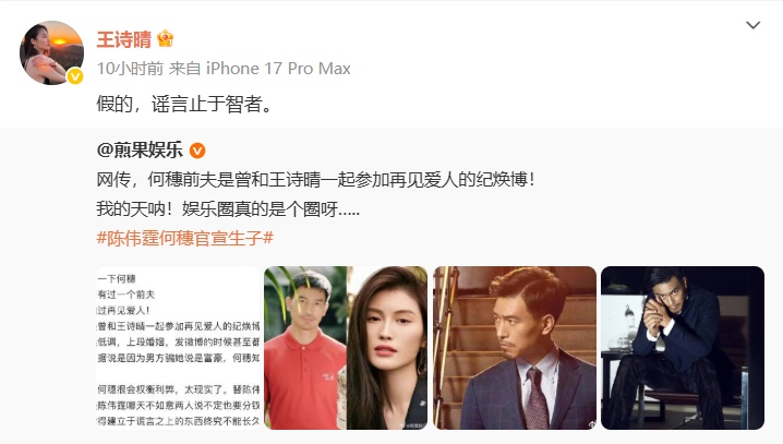對此,與紀煥博一同參加《再見愛人3》的嘉賓王詩晴在個人社交平臺發(fā)文辟謠,直言“假的,謠言止于智者”。