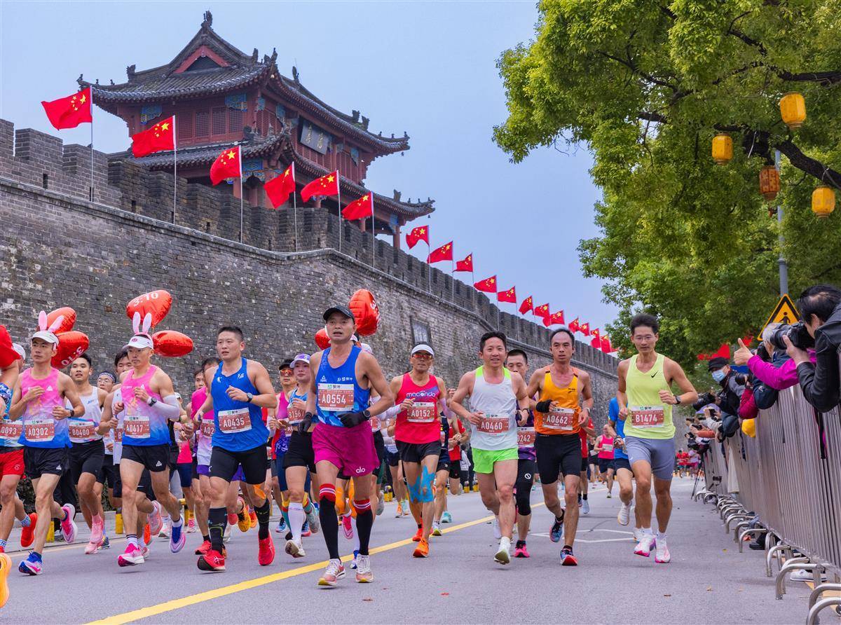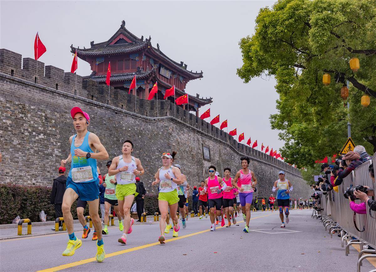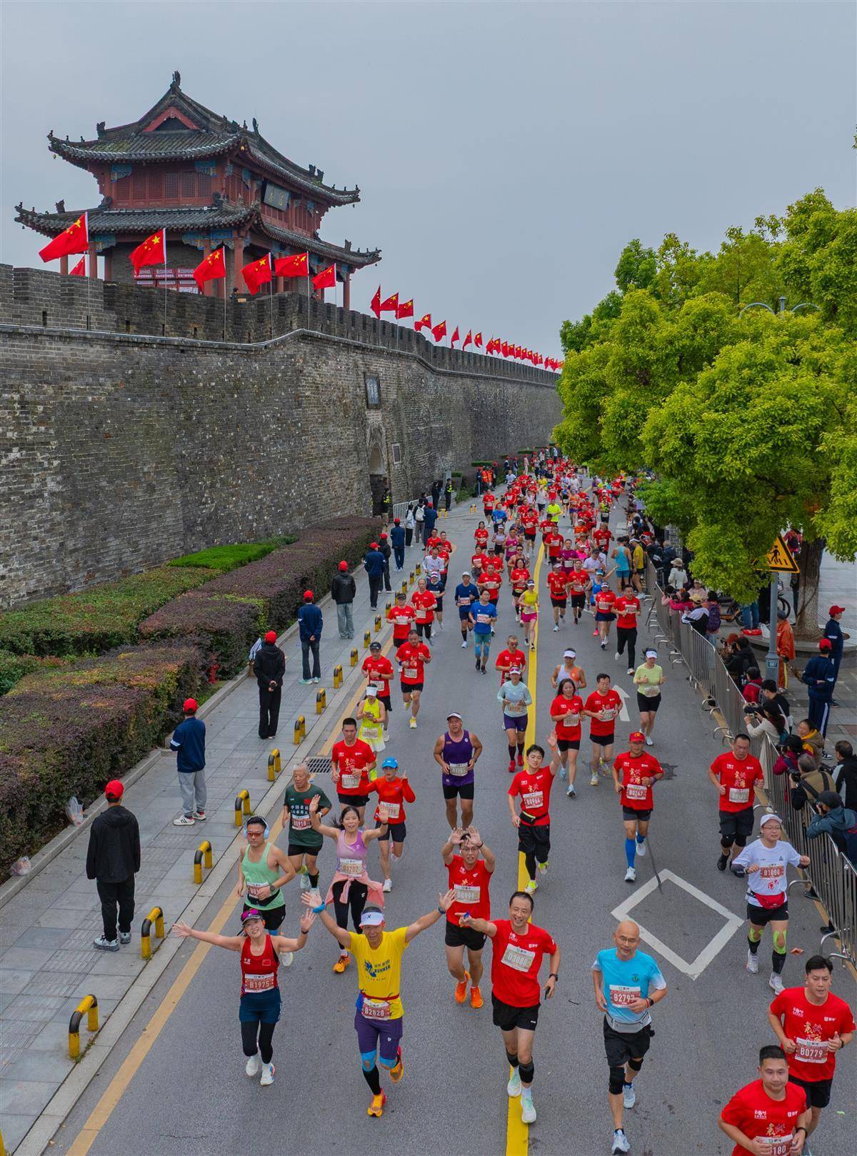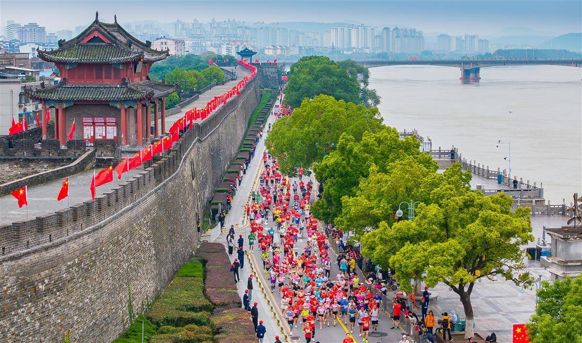 10月19日,襄陽馬拉松選手們從襄陽古城臨漢門前跑過。(湖北日報全媒記者 柯皓 攝)