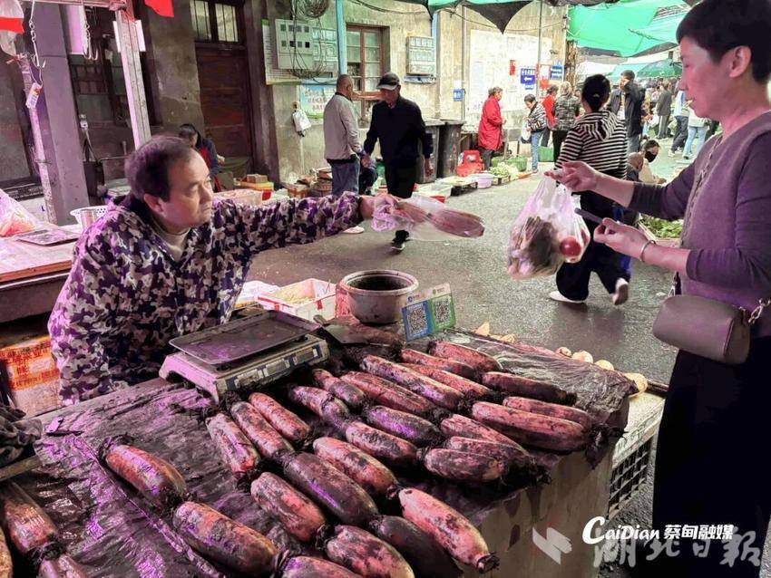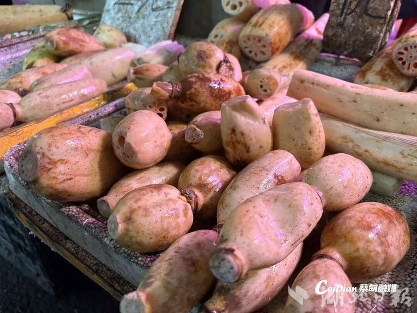 在建新菜場,藕攤前顧客絡繹不絕。“這些都是今早剛挖的,特別新鮮。”商販王小梅正在整理剛到貨的蓮藕,她介紹,自己從事蓮藕銷售數十年,自家承包了600多畝藕塘,最近正值粉藕上市季節,每天最多能賣出1000多斤。