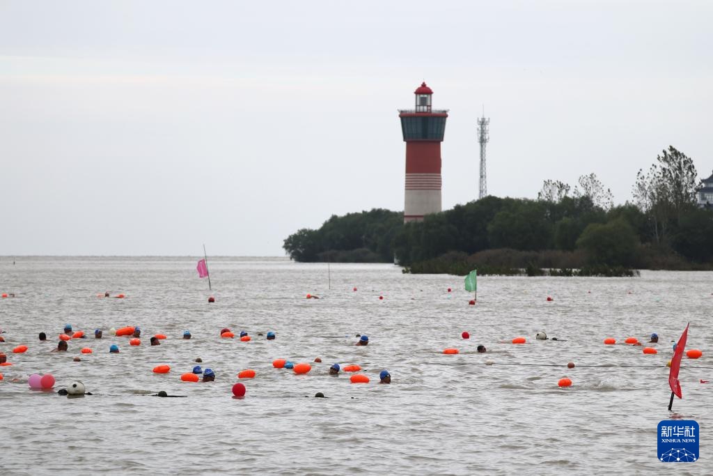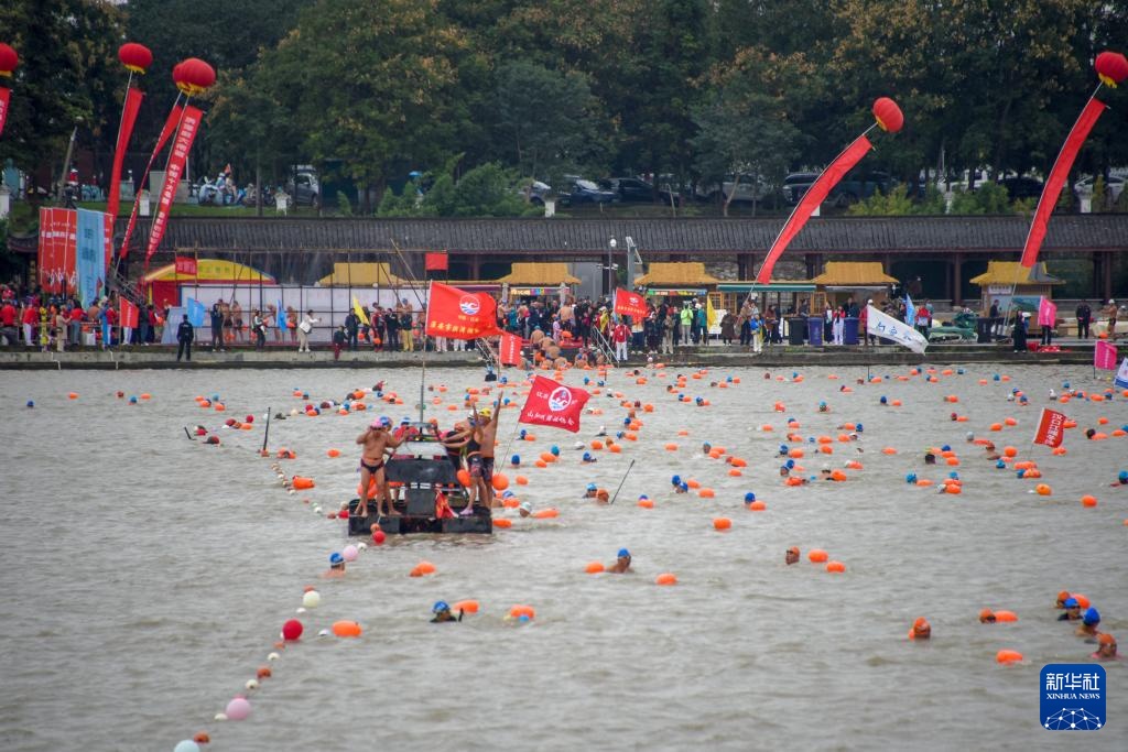 10月19日,選手在江蘇省淮安市洪澤區(qū)漁人灣浴場參加游泳比賽。