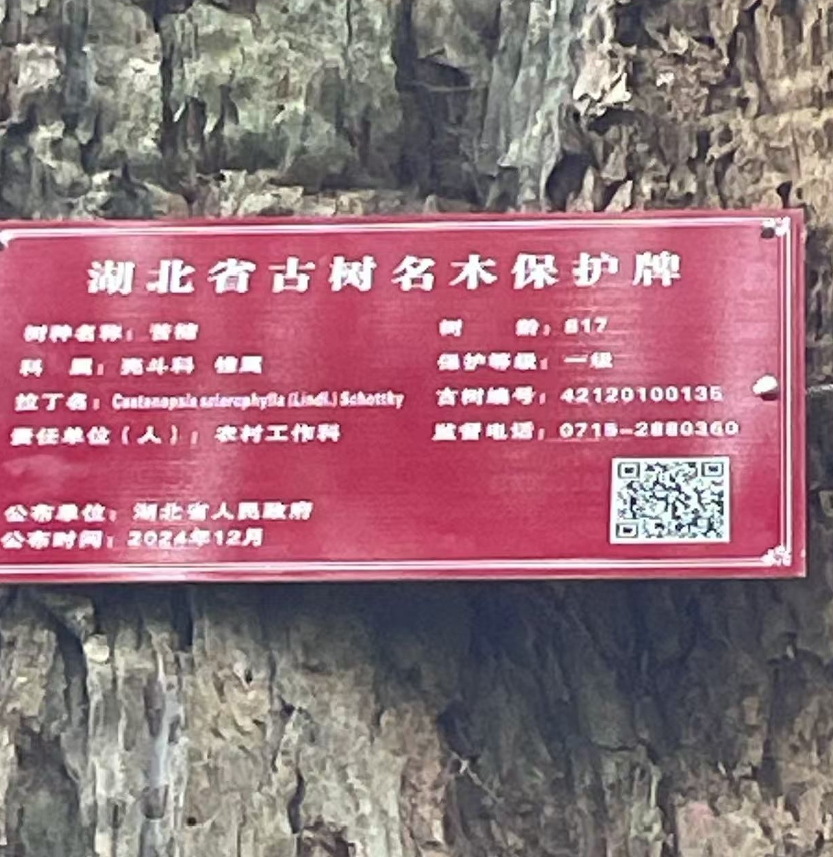 新保護牌兼具實用性與科普性:正面清晰標注古樹的樹齡、樹種、科目等核心信息,就連胸圍等關鍵數據也精準呈現,如一株一級古樹的810年樹齡一目了然;背面創新性融入九宮山保護區專屬二維碼,游客掃碼即可實時查閱古樹的生長歷程、生態價值,以及背后承載的地方人文故事,讓原本“沉默”的古樹成為公眾親近自然、了解生態的直觀窗口。