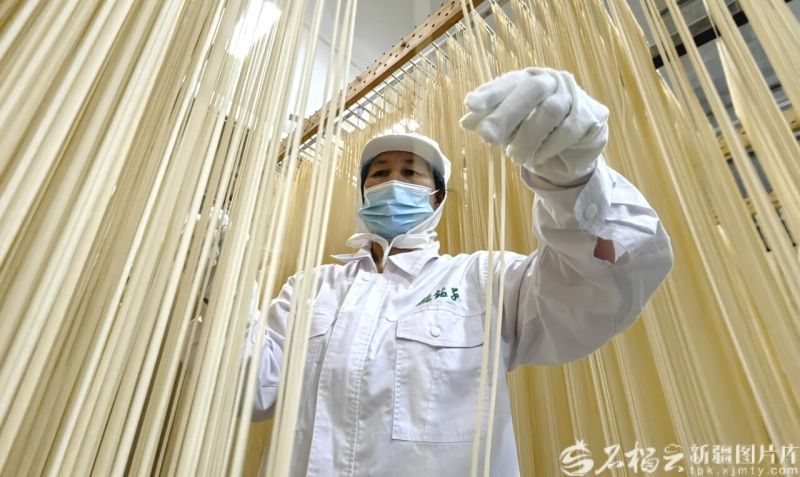 奇臺縣半截溝鎮腰站子村農業產業園,工人在將晾曬的掛面進行分面(資料圖)。