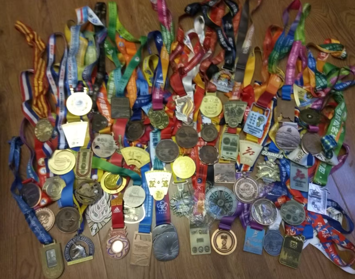 周勇到各地參加馬拉松贏得的獎牌。(受訪者供圖)